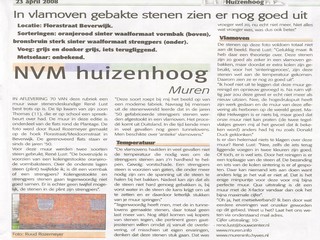 De bovenzijde is voorzien van een kolengestookte oranje rode vormbaksteen. Over de onderste lagen steen (plint) heb ik nog even lopen twijfelen. Is dit een vormbak steen of is dit een strengpers steen? Kolen gestookte stenen en strengpers stenen gaan tegenwoordig niet goed samen. Er is echter geen twijfel mogelijk, de plint stenen zijn strengpers stenen. Strengpers stenen roepen bij mij het beeld op van een moderne fabriek. Navraag bij mensen uit de stenen wereld, die nog langer meedraaien dan ik, leerde mij dat in de jaren 50 strengpers stenen werden gemaakt welke werden afgestookt in een vlamoven. Het procedé van strengpers stenen was komen overwaaien uit Duitsland. In die tijd kende men in veel gevallen nog geen tunnel ovens. Men had de beschikking over de “antieke” vlamovens. Dat heeft men geweten. De vlamovens haalde in veel gevallen niet de temperatuur die nodig was om de strengpers stenen aan zijn hardheid te laten komen. Gevolg vorstschade. Een strengpers steen is voorzien van gaten. Ik heb al eens uitgelegd dat deze gaten o.a. nodig zijn om de spanning uit de steen te halen bij het bakken van de steen. Nadeel van deze gaten kan zijn dat als de steen niet hard genoeg gebakken is er bij vorst het aanwezige water in de steen de kans krijgt om uit te zetten en daardoor letterlijk stukken van je muur springen. Tegenwoordig heeft men, met de in tunnelovens gemaakte stenen, daar totaal geen last meer van. Maar nog altijd komen wij kopers van stenen tegen die pertinent geen gaatjes stenen willen hebben omdat zij vanuit de overlevering, of misschien uit eigen ervaringen, denken dat deze stenen stuk gaan. Dat was vroeger wel zo, nu echt niet meer. Niet alles wat vroeger was, was dus ook beter, zoals menigeen nogal eens wil zeggen. De stenen op deze foto voldoen totaal niet aan dit beeld, gelukkig maar. Ik heb daar een theorietje over. Deze stenen zijn zo goed als zeker in een vlamoven gebakken maar doordat er extra kolen zijn gebruikt, voor het sintering proces, zijn deze stenen wel aan de temperatuur gekomen en zien er daarom nog zo goed uit. Ik hoef u niet uit te leggen dat deze muur gereinigd en opnieuw gevoegd is. Na ruim 50 jaar zou deze gevel er echt niet meer als nieuw uitzien. Nee de hogedrukspuit heeft zijn werk gedaan en onze muur als herboren op de wereld gezet. Marijke Helwegen is er niets bij, maar goed dat onze muur niet kan praten (de 2 tegelvlakjes geven mij al het gevoel dat ik bekeken wordt) anders had hij nu als Donald Duck geklonken. Is er dan helemaal niets te klagen over deze muur? Nee, zelfs de iets terug liggende voegen in twee kleuren zijn goed. Of toch, er is wel iets. Door het reinigen is er een toplaagje van de steen af. De bezanding en iets van de kolen sintering is er af gespoten. Daar kan niemand iets aan doen want anders krijg je het vuil er niet af. Dat is het enige min puntje voor deze voor mij bijna perfecte muur. Qua uitstraling is dit een muur met de X-factor vandaar dan ook het bijna maximale cijfer. Oh ja het metselverband? Ik ben door wat eerdere ervaringen wat onzeker geworden op dit gebied. Weet u het? Laat het ons weten via onderstaand mail adres.