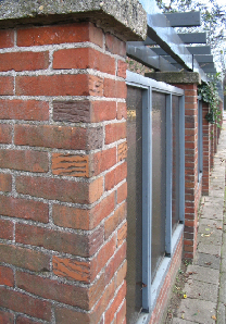 bonte donkere vlekken, statige huizen met een fris uiterlijk. Maar ook de achter liggende garages zijn van deze stenen opgetrokken. Op het eerste oog is er niets mis met deze steen. Maar de regelmatige lezer van deze rubriek heeft al lang aan deze foto gezien dat er iets niet klopt. (toch!) Want de hier verwerkte strengpers stenen zijn verkeerd om verwerkt. Het duidelijks zie je dat op de kopse kanten van de steen die voorzien zijn van boomschors motief.