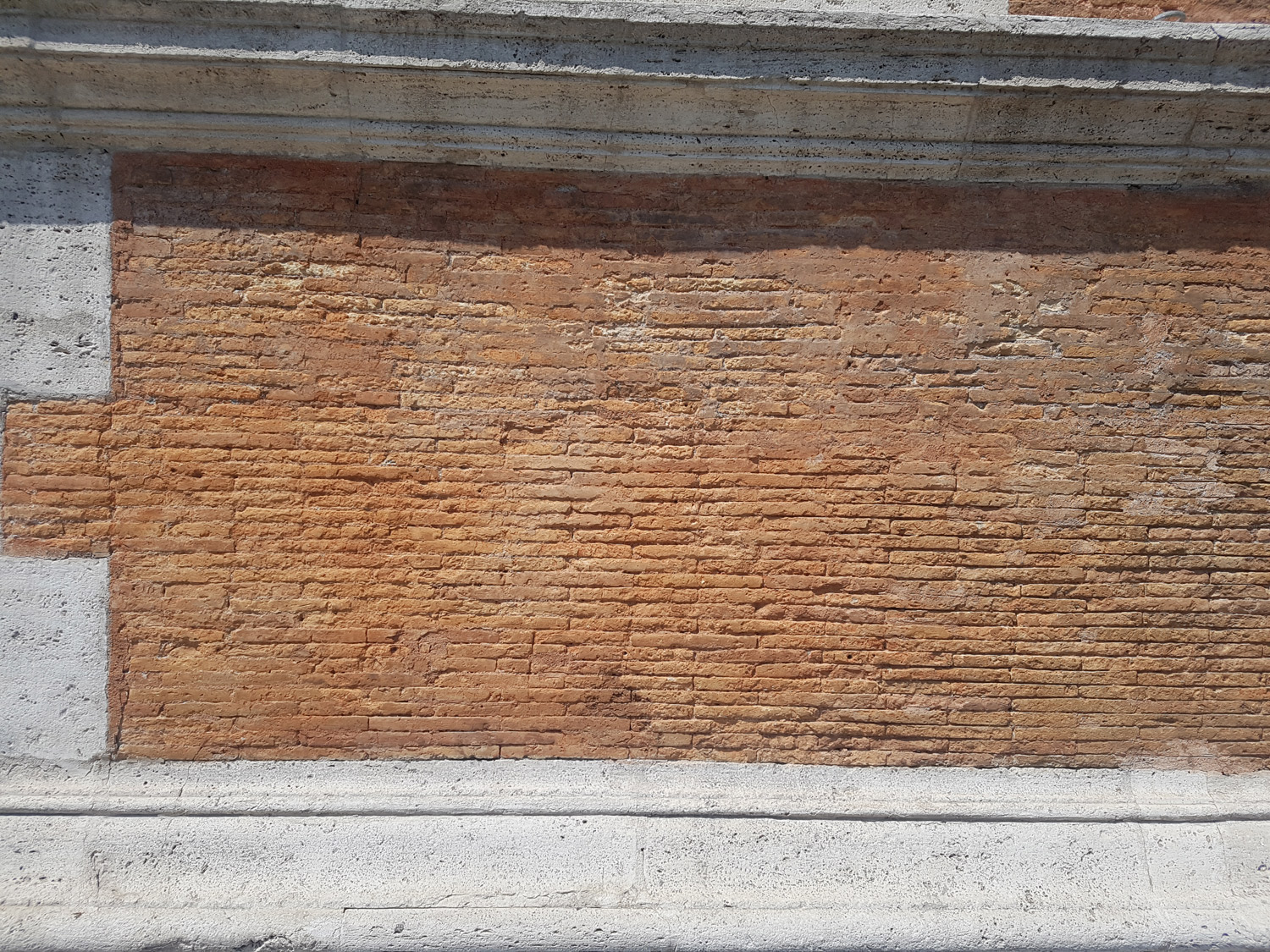 De stenen zijn dun maar de voeg is ook relatief dun, e.e.a. in halfsteens verband gemetseld, geen idee of de Romeinen zich met andere verbanden bezig hielden. De frisse oranje stenen houden in ieder geval al jaren stand.